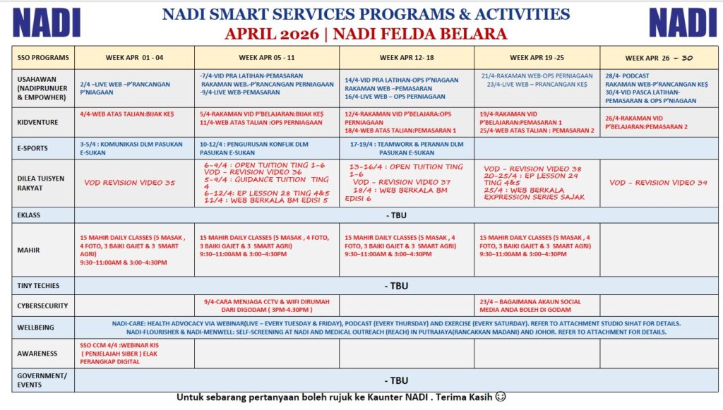 Berikut merupakan jadual aktiviti/program Perkhidmatan Pintar bagi bulan April 2026 . Untuk maklumat lanjut boleh hubungi petugas NADI .