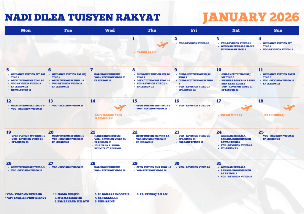 Berikut merupakan Jadual Kelas Dilea bagi Bulan Januari 2026 Sebarang perubahan akan dimaklumkan kemudian .