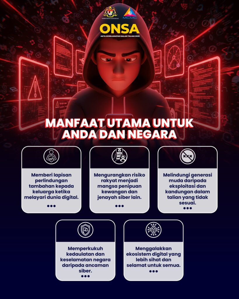 Akta Keselamatan Dalam Talian 2025 (ONSA) berperanan memperkukuh perlindungan kepada rakyat, mengurangkan risiko jenayah siber serta memastikan generasi muda terus dilindungi daripada ancaman dalam talian.
