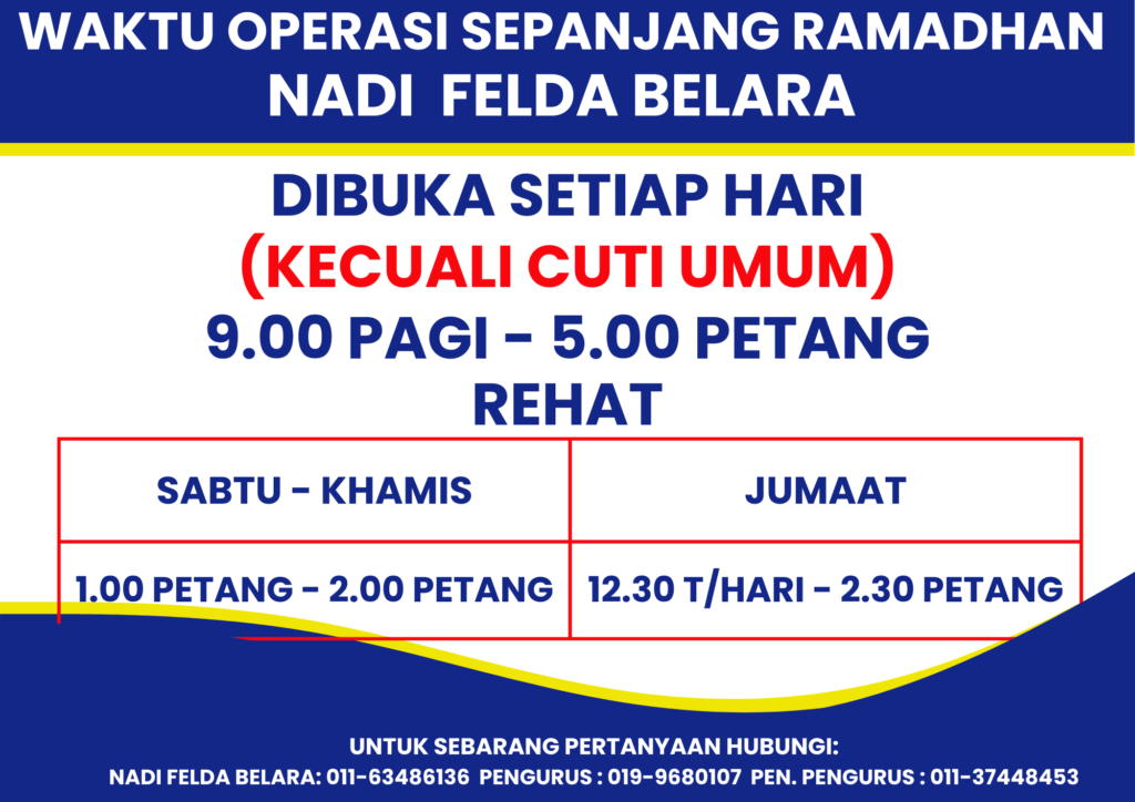 Sepanjang bulan Ramadhan, NADI FELDA BELARA dibuka setiap hari (kecuali cuti umum) dari: